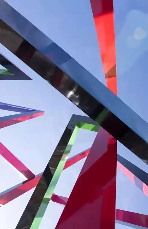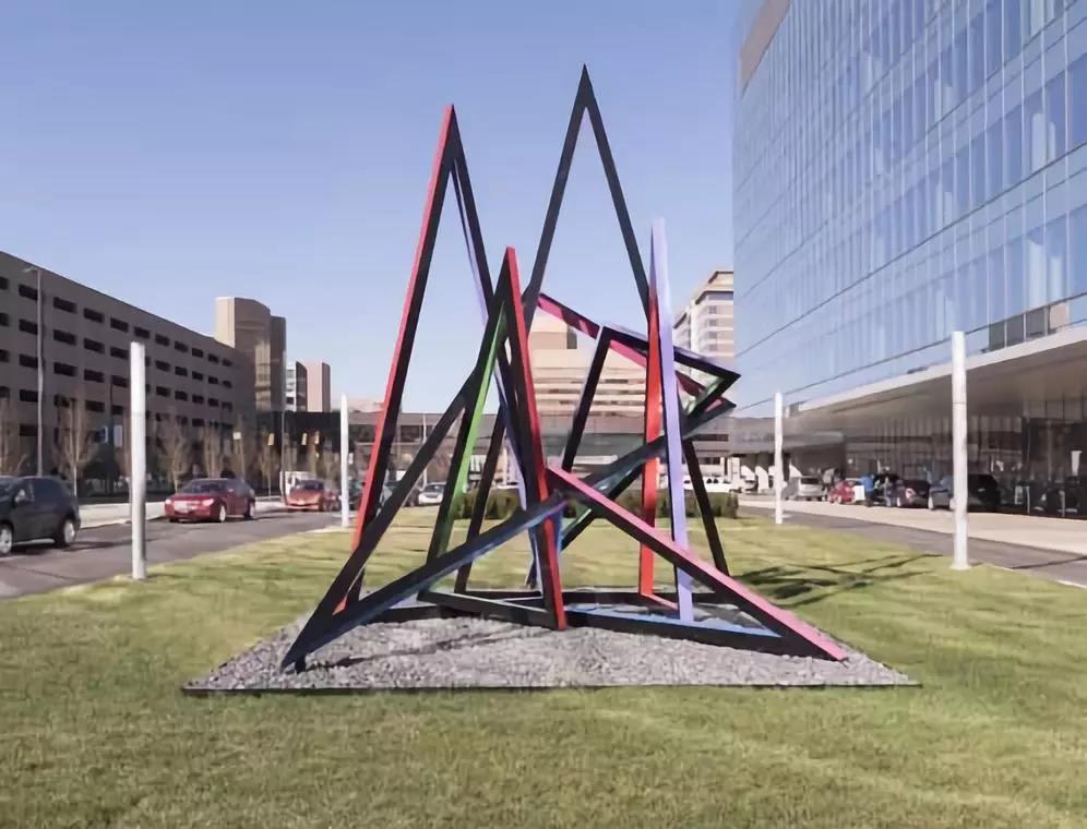 這幅由藝術(shù)家伊娃·羅斯柴爾德創(chuàng)作的彩繪鋁片“活邊”是為2016年正式營業(yè)的克利夫蘭托西格癌癥中心設(shè)計(jì)的。這座約6.7米高的雕塑由7個(gè)逐漸縮小的三角形組成,藝術(shù)家將這些三角形描述為相互交叉的物體,形成一個(gè)開放的、自我支撐的、從地面升起、吸引視線的結(jié)合體。這件作品似乎不受地心引力的影響,因?yàn)樗慕Y(jié)構(gòu)依賴于每一個(gè)元素來支撐另一個(gè)元素,創(chuàng)造了一個(gè)復(fù)雜的支撐系統(tǒng),與患者的經(jīng)歷相似。
