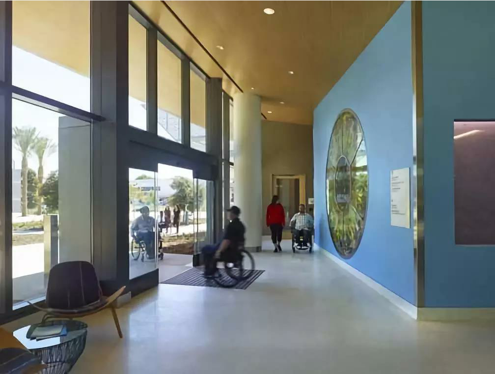 位于美國加利福尼亞州唐尼的瑞秋洛斯阿米哥斯國家康復(fù)中心有著長期使用藝術(shù)作為職業(yè)治療的歷史,突出展示了其藝術(shù)性。廣場和建筑內(nèi)部的原始作品是由洛杉磯縣藝術(shù)委員會委托的。在這些作品中,有德·拉·托瑞兄弟、埃納爾和雅梅克斯·德·拉·托瑞的《活力漩渦》,該作品以生命之樹為主題,它是生長、庇護(hù)和復(fù)雜系統(tǒng)的普遍象征,旨在反映康復(fù)中心的工作場景。