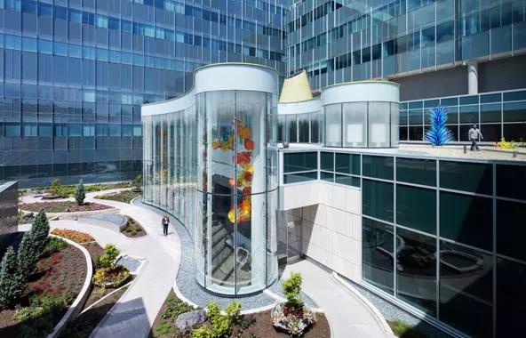 弗雷德·帕梅拉·巴菲特癌癥中心位于美國內(nèi)布拉斯加州奧馬哈市,新建立的藝術(shù)治療中心占地面積約340平方米。這座兩層樓高的“避難所”建筑位于醫(yī)院和科研樓之間。建筑使用了“日出波斯圓柱”,可以俯瞰療養(yǎng)花園,呈現(xiàn)出“花道玻璃對玻璃”的設(shè)計(jì)感,陳列作品為日本花道風(fēng)格的插花圖案,呈現(xiàn)在涂有琺瑯的玻璃上,室內(nèi)使用LED照明,利用光影來突出顏色深淺和飽和度。
