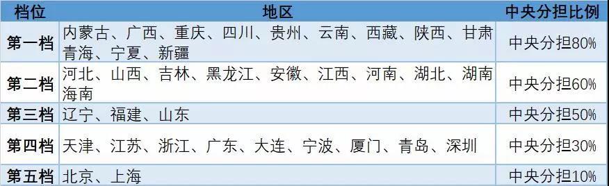 從表格中可以看出,經(jīng)濟(jì)水平欠發(fā)達(dá)地區(qū),中央分擔(dān)比例較高,而在經(jīng)濟(jì)實力較強(qiáng)的地區(qū),中央分擔(dān)的比例也相對減少。