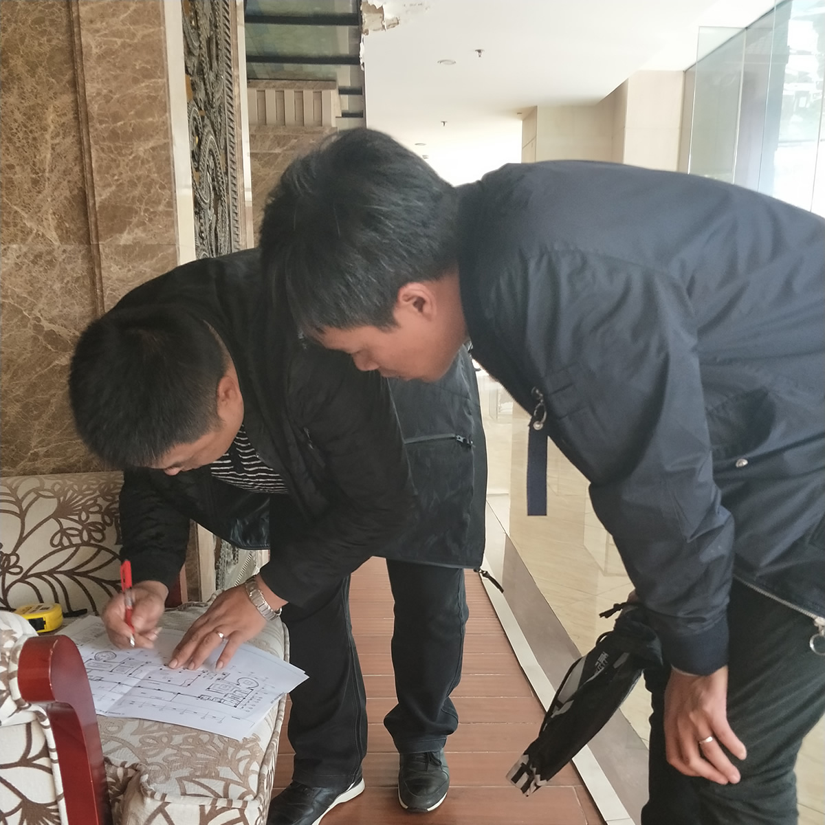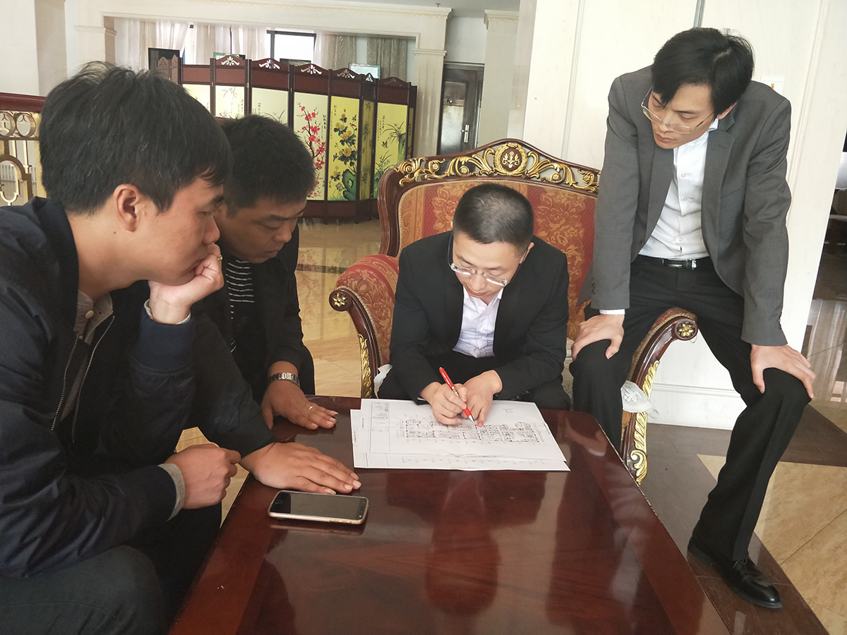 文峰國際負(fù)責(zé)人拿出建筑圖紙,與醫(yī)匠設(shè)計(jì)師進(jìn)行面對面溝通,醫(yī)匠設(shè)計(jì)師結(jié)合現(xiàn)場情況和圖紙,與甲方就室內(nèi)設(shè)計(jì)進(jìn)行熱烈的討論。