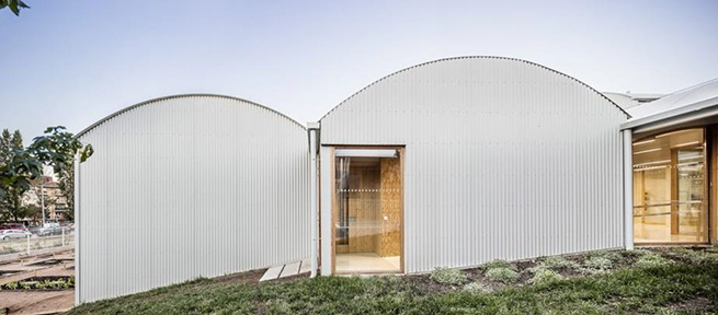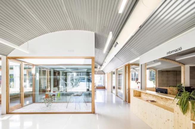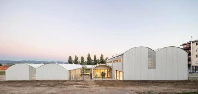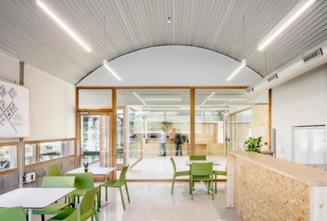 該建筑具有經(jīng)濟(jì)效益,模塊化和高效的能源系統(tǒng),可以根據(jù)內(nèi)部空間的功能和外部氣候來(lái)調(diào)節(jié)能源需求。間距2.4米跨度6米的金屬結(jié)構(gòu)支撐起輕便,易于通風(fēng)的拱形屋頂,部分屋頂可以在夏天時(shí)開(kāi)啟,便于通風(fēng),可在冬季關(guān)閉,防止熱量散失。