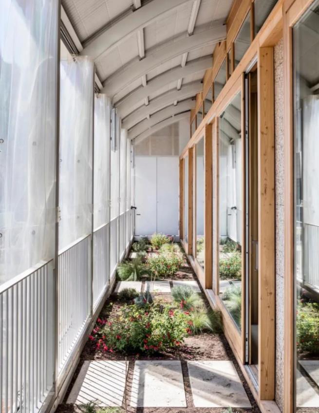 南立面上的蔬菜溫室是一處被動(dòng)生物氣候調(diào)整系統(tǒng)。這些空間中的 pvc 簾幕的可以閉合,以便在冬季封閉以積聚熱量,并通過(guò)通風(fēng)系統(tǒng)引入室內(nèi);或在夏季開(kāi)放敞開(kāi),形成門廊提供蔭蔽。這些空間中的植被是都是由康復(fù)治療中心的患者種植的,同時(shí)也是他們治療的一部分。
