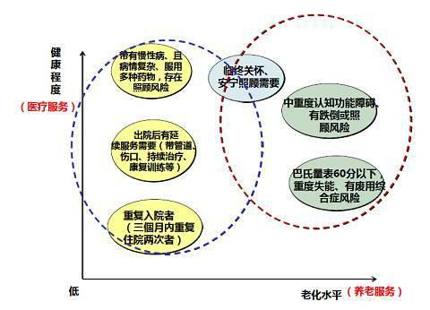醫(yī)養(yǎng)結(jié)合是將現(xiàn)代醫(yī)療服務(wù)技術(shù)與養(yǎng)老保障模式有效結(jié)合,實(shí)現(xiàn)了“有病治病、無病療養(yǎng)”的養(yǎng)老保障模式創(chuàng)新。近似于美國(guó)的管理性醫(yī)療服務(wù),基于資源整合理論。不是簡(jiǎn)單的醫(yī)療與養(yǎng)老職責(zé)的相加,需要滿足資源利用合理化基本原則,包括:精準(zhǔn)合理的服務(wù)定位、政策配套與頂層設(shè)計(jì)、醫(yī)療和養(yǎng)老服務(wù)模式有機(jī)整合、按供需平衡需要合理配置資源、資源共享避免重置與浪費(fèi)。社會(huì)化養(yǎng)老服務(wù)的剛需來源于自我照顧能力不足的老人,或家庭功能或照顧者能力不足的老人,而這其中如果將養(yǎng)老服務(wù)與醫(yī)療服務(wù)需求作為兩個(gè)需要維度的話,強(qiáng)調(diào)老年照顧中的醫(yī)療和照護(hù)兩個(gè)方面。