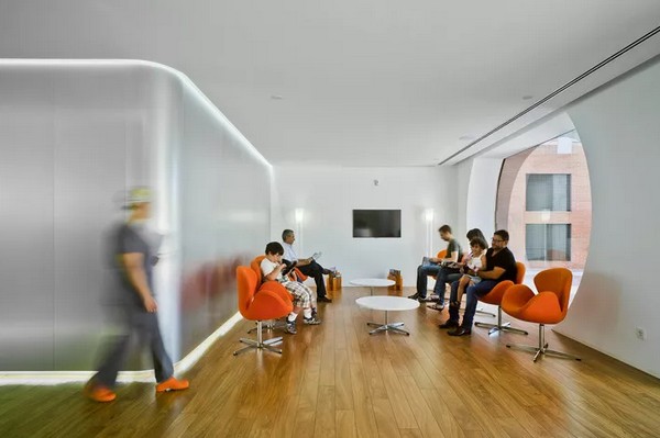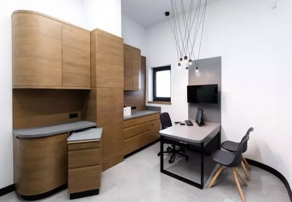 診所的整體設計主要展現(xiàn)出空間的功能性、友好性。白色的前臺由橡木桌子構成,外形模仿醫(yī)療十字架,形象表達出該建筑的實際用途。其必要的功能都沿著曲線排列,在這個公共區(qū)域營造出一種平靜的感覺,更重要的是前臺的獨特設計給初來的顧客留下良好的印象。