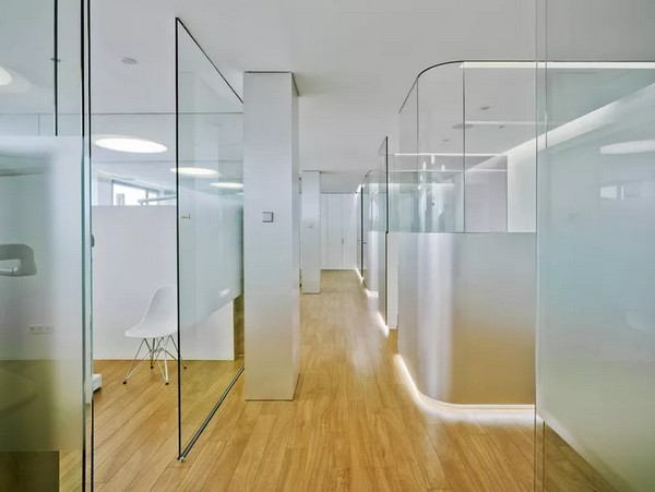 整個空間使用了通透的玻璃、中央的鋁制金屬盒以及溫馨而親切感的木質(zhì)地面三種材料創(chuàng)建了連續(xù)的、與職業(yè)相關的空間。