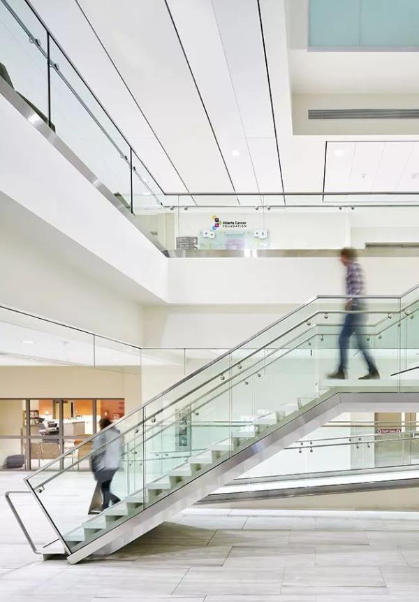 步梯將一層入口大廳和二層中庭公共空間有效銜接起來,樓梯兩側(cè)使用透明玻璃欄桿和金屬扶手,踏步使用白色大理石臺(tái)階,加強(qiáng)了室內(nèi)的亮度,向公眾展示了開放的意圖,并創(chuàng)造一個(gè)開放、干凈的就診環(huán)境。