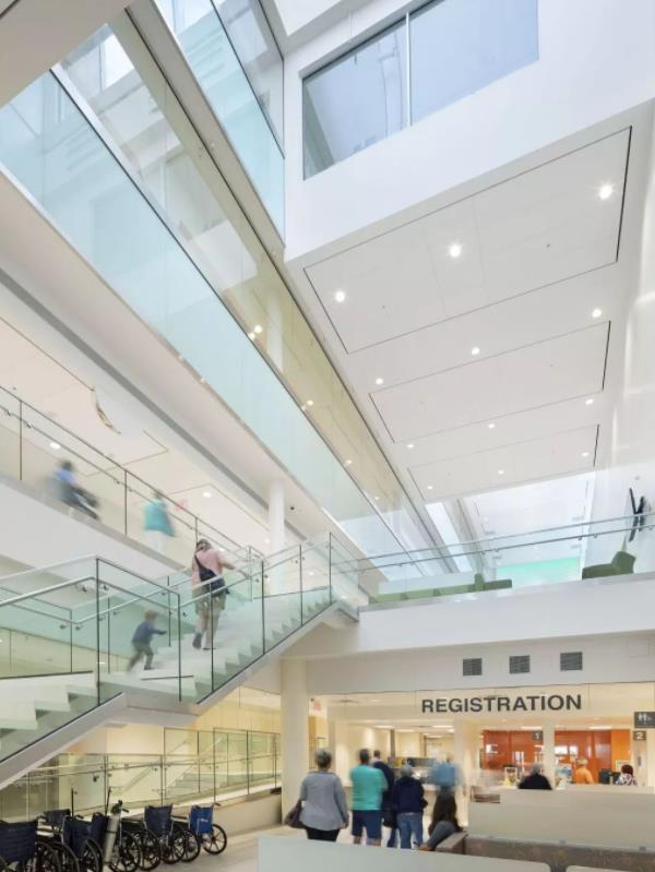 新建筑無時(shí)不刻體現(xiàn)了與外界大自然的連接。公共等候區(qū)的超大玻璃窗戶設(shè)計(jì)為患者及其家屬提供了良好的戶外景觀視野,可減少患者的束縛感。