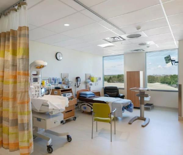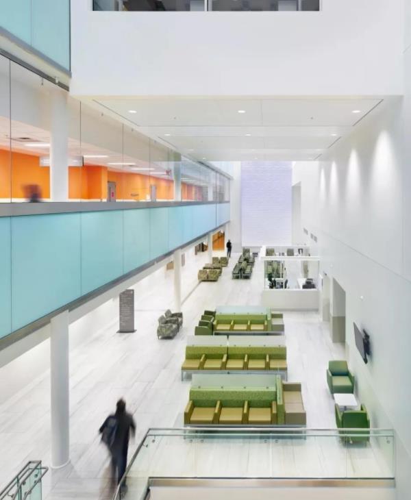 明亮的橙色,黃色和綠色用來區(qū)分臨床區(qū)域,這在醫(yī)院的室內(nèi)設(shè)計(jì)中增添了獨(dú)特的尋路元素。其他的創(chuàng)新設(shè)計(jì)元素包括配有玻璃窗的手術(shù)室,更容易自然采光,如果自然光線充足,室內(nèi)光源則會(huì)自動(dòng)斷電,地板和與天花板使用柔和色調(diào)。