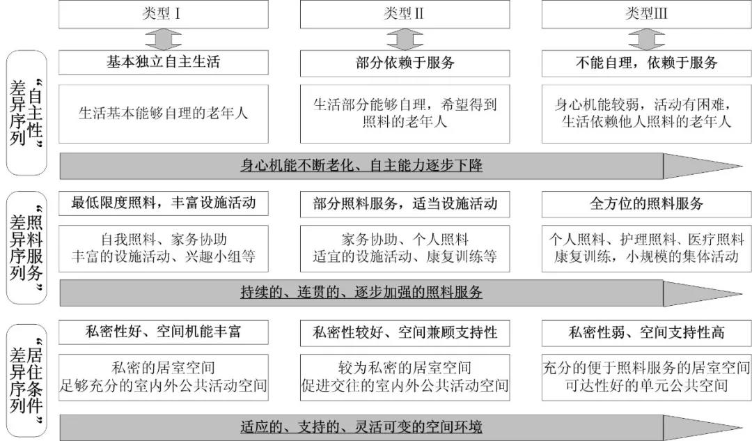 針對(duì)于我國(guó)目前養(yǎng)老設(shè)施現(xiàn)狀,需要對(duì)現(xiàn)有單一的養(yǎng)老設(shè)施類型進(jìn)行重新定位,構(gòu)建新型的養(yǎng)老設(shè)施居住體系,提供差異性的空間居住條件和照料服務(wù),實(shí)現(xiàn)滿足不同自理程度老年人的差異性需求。