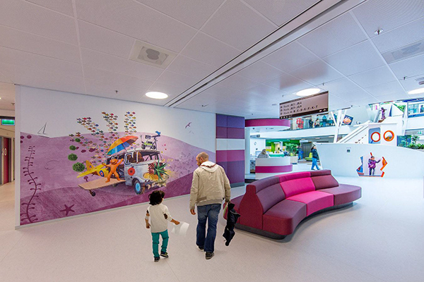 例如,在兒科區(qū)域的設(shè)計中,可通過色彩的應(yīng)用于搭配來緩解患兒的情緒,如紅色、橙色、黃色等暖色系對治療和康復(fù)有輔助作用,還可以采用大地、海洋、森林等自然色彩或以卡通人物和各種動物為背景,從而提高空間的活躍度,營造視覺上的豐富感。
