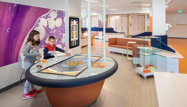 醫(yī)院的3層,設(shè)計(jì)了一個戶外花園,吸引孩子們走出去擁抱自然風(fēng)景。醫(yī)院還設(shè)計(jì)了“科學(xué)探索中心”,通過互動裝置幫助孩子們了解疾病的診斷和治療,從而降低他們的心理壓力。