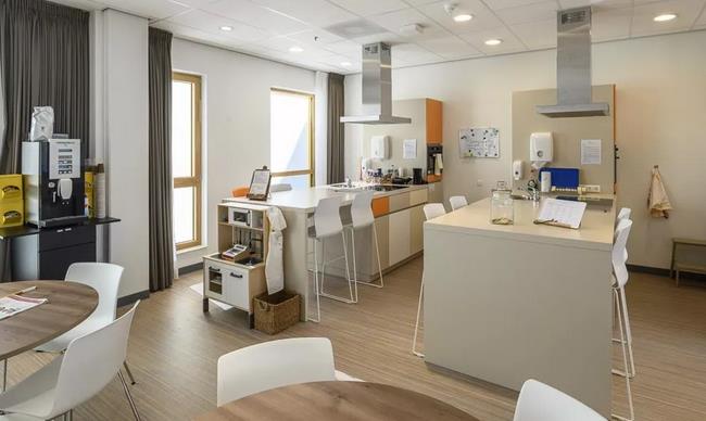 2樓和3樓設(shè)有帶廚房的用餐室。廚房設(shè)備齊全,配有洗碗機(jī),只要提前預(yù)約、自備食材,就可以在這里做飯、用餐,非常有生活氣息。病房是套間規(guī)格的,患兒及家屬能享受到戶外風(fēng)景,室內(nèi)配備了簡單的家具,家長可以睡在相鄰的房間,以便隨時照顧孩子。