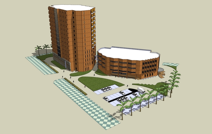 高層與裙房組成,病房設置在高層中,門診及醫(yī)技在裙房部分,優(yōu)點是各部分聯(lián)系方便,節(jié)省用地。缺點是各部門分隔不易處理,易發(fā)生干擾、路線交叉現(xiàn)象。